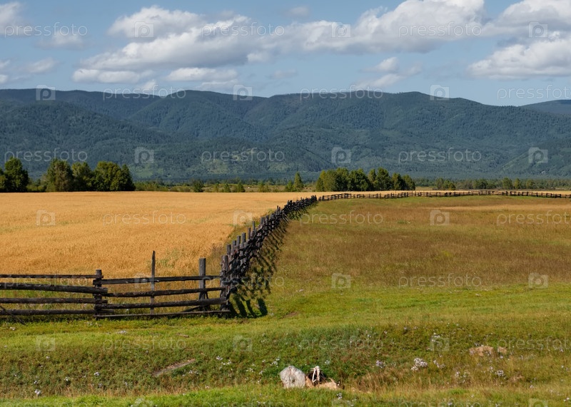 Россия. Республика Бурятия. Вид на поля в долине реки Иркут, огороженные деревянным забором особой конструкции из досок и бревен