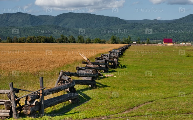 Россия. Республика Бурятия. Вид на поля в долине реки Иркут, огороженные деревянным забором особой конструкции из досок и бревен