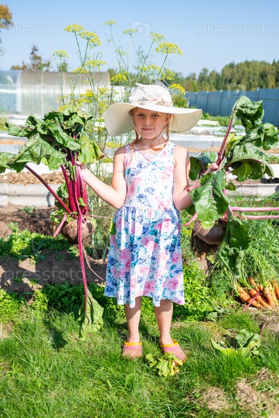 Девочка держит в руках огромную свеклу. Большая свекла выросла осенью на огороде. Осень. Уборка урожая. Овощи. Девушка держит в руках огромную свекву. Крупные свеклы росли осенью в саду. Осень. Жатва. овощи