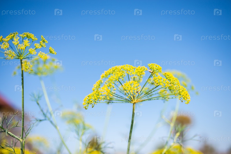 Укроп расцвел летом на грядке. Укроп вырос в огороде. Осень. Зелень. Кулинарные ингредиенты. Приправы. Дилл цветет летом в саду. Дилл растет в саду. Осень. Зелёные растения. Кулинарные ингредиенты. Специи