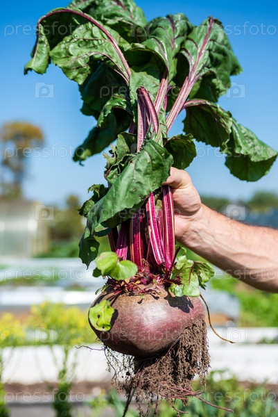 В саду выросла большая свекла. Огромная свекла в руке мужчины. Осень. Уборка урожая. Овощи. Большая свекла выросла в саду. Огромная свекла в руке человека. Осень. Сбор урожая. овощи