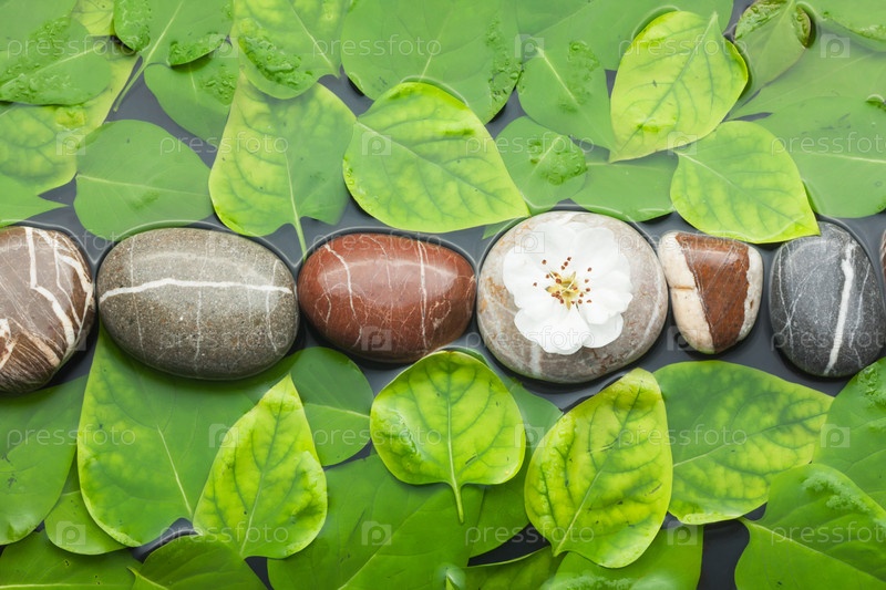 Полосатые камни и лист в воде на мокром фоне