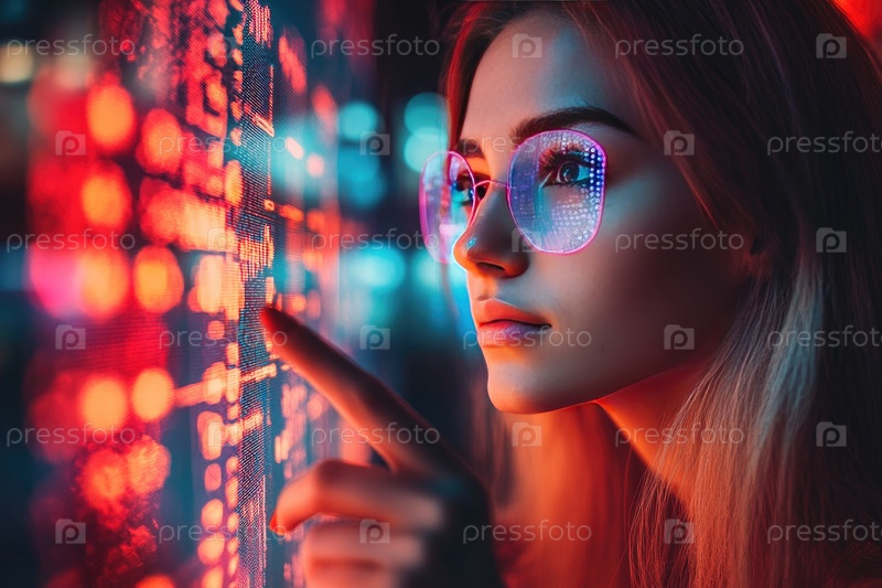 Молодая женщина в очках ориентирована на красочный цифровой дисплей данных, освещенный яркими огнями, демонстрирующий современную технологическую атмосферу, подчеркивающую инновации и вовлеченность