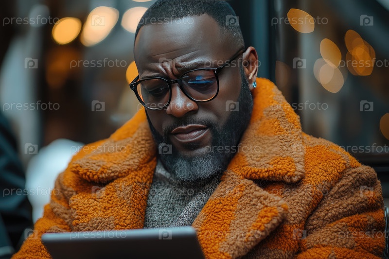 Афроамериканец, одетый в модное оранжевое пальто, ориентирован на использование планшета в уютном кафе, в окружении теплого окружающего освещения и мягких текстур, создавая притягательную атмосферу