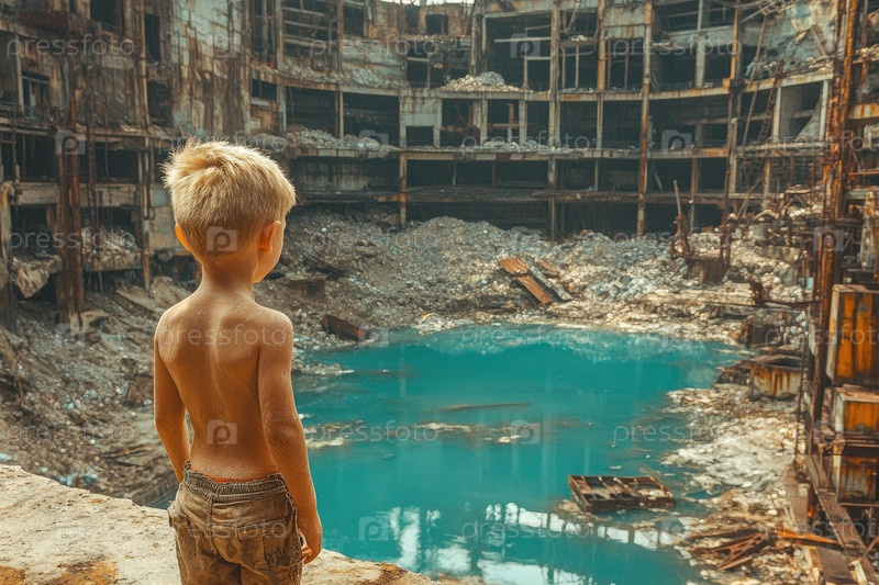 Молодой мальчик с короткими светлыми волосами смотрит на бирюзовый бассейн с водой в ветхом здании, окруженный щебнем и остатками некогда шумной среды, вызывая чувство заброшенности