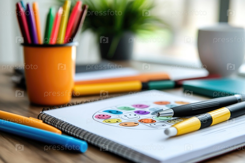 Красочные канцелярские принадлежности с веселыми рисунками с улыбкой на лице расположены на деревянном столе, окруженном яркими ручками в чашке и небольшим зеленым растением, создавая оживленную атмосферу рабочего пространства