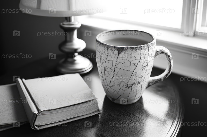 Разбитая керамическая кружка, наполненная теплым напитком, сидит рядом с открытой книгой на полированном деревянном столе, освещенном мягким светом от соседней лампы, создавая уютную атмосферу