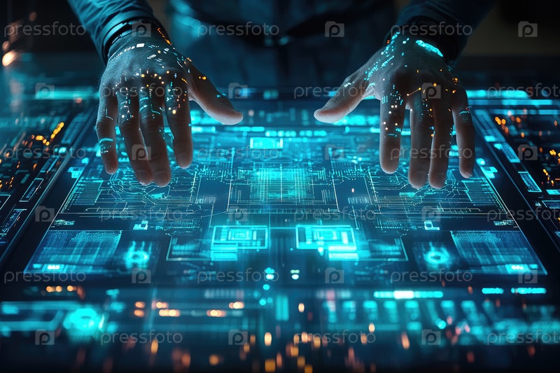 Футуристические руки связаны с голографическим интерфейсом, который демонстрирует сложные цифровые данные и технологии, создавая захватывающий опыт в высокотехнологичной среде, наполненной светящимися элементами