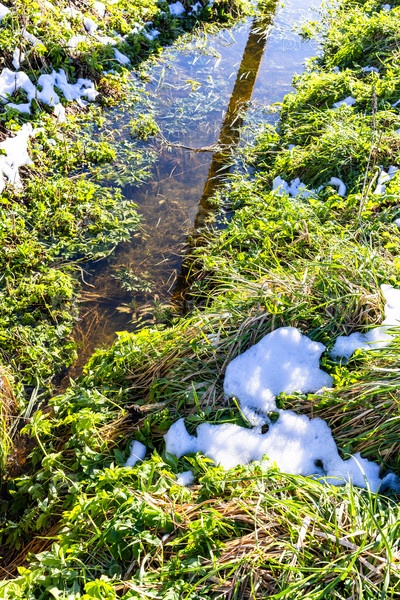 Свежевыпавший снег на зеленой траве возле канавы
