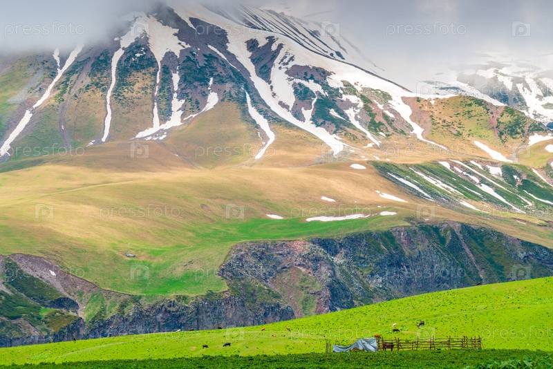 Склон Кавказских гор с остатками снега в июне, живописный горный ландшафт Грузии