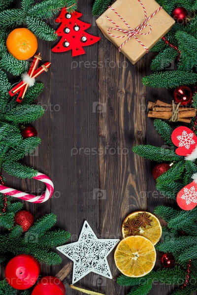 Декорации для рождественской елки, зеленые ветки на столе и пространство в центре каркаса концепт праздника