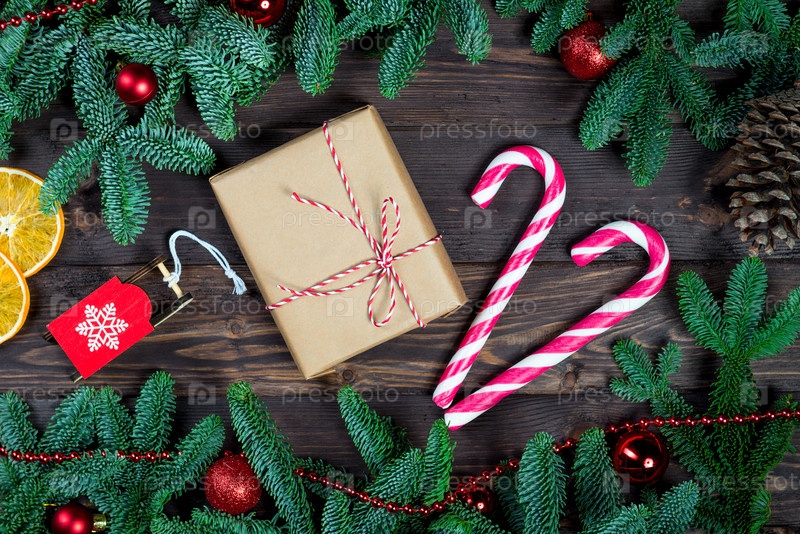Рождественский подарок и две сладкие полосатые конфеты в окружении рождественских предметов