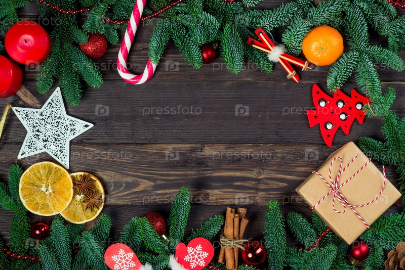 Горизонтальная карта Декорации для рождественской елки, зеленые ветки на столе и пространство в центре каркаса праздничной концепции