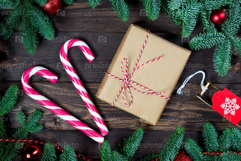 Рождественская открытка, две конфеты и подарок в стиле ретро в окружении зеленых веток елки