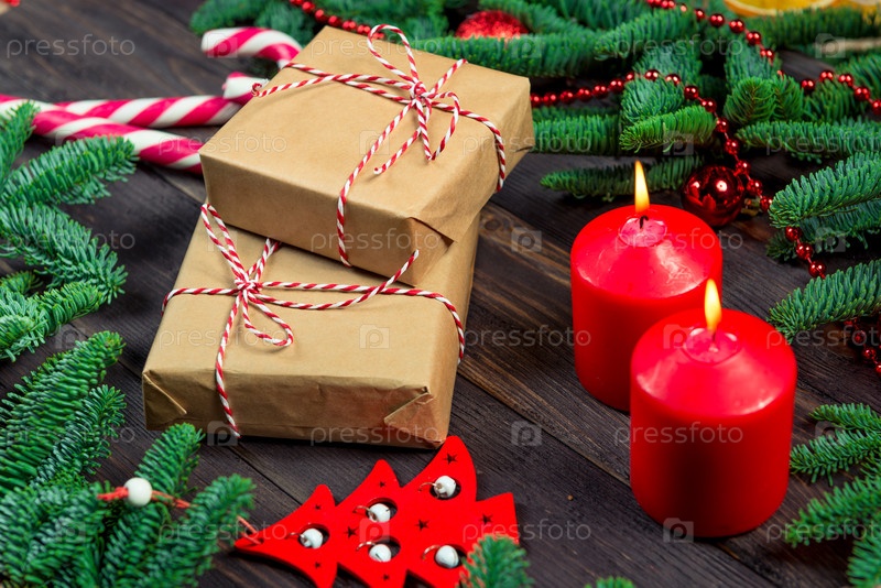 Декоративные рождественские элементы рядом с подарками для близких на темном столе
