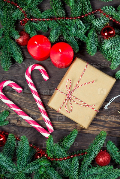 Вертикальная открытка Рождественский ретро-подарок и сладкий конфетный тростник с красными свечами и зелеными еловыми ветвями вид сверху