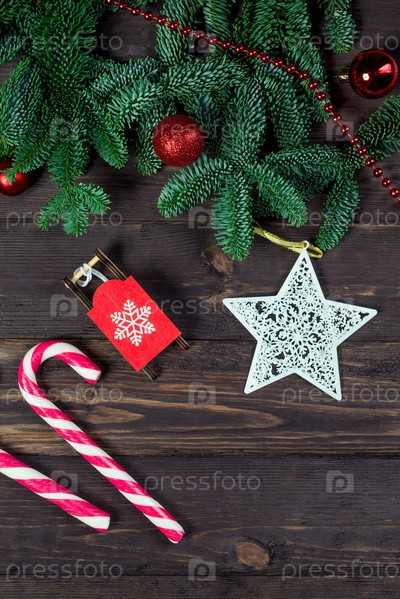 Конфетные трости и украшения на столе с еловыми ветвями крупным планом концепт праздничных предметов