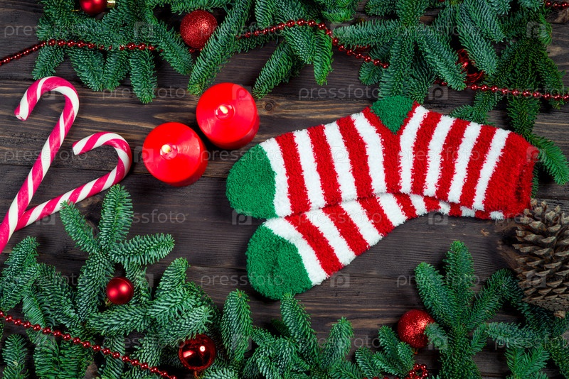 Два полосатых новогодних носка, пушистые ветви ели концепт рождественского подарка