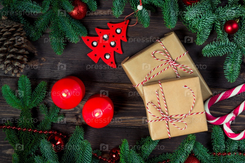 Вид на два подарка из крафтовой бумаги, горящие рождественские свечи и игрушки рядом с еловыми ветвями