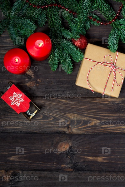 Подарок и горящие свечи на темном деревянном столе с еловыми ветвями крупным планом вид сверху