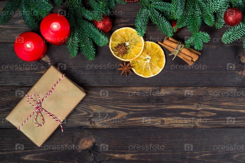 Подарок, завернутый в грубую бумагу и украшения ручной работы на деревянном столе, окруженном еловыми ветвями, пространство для надписи в центре