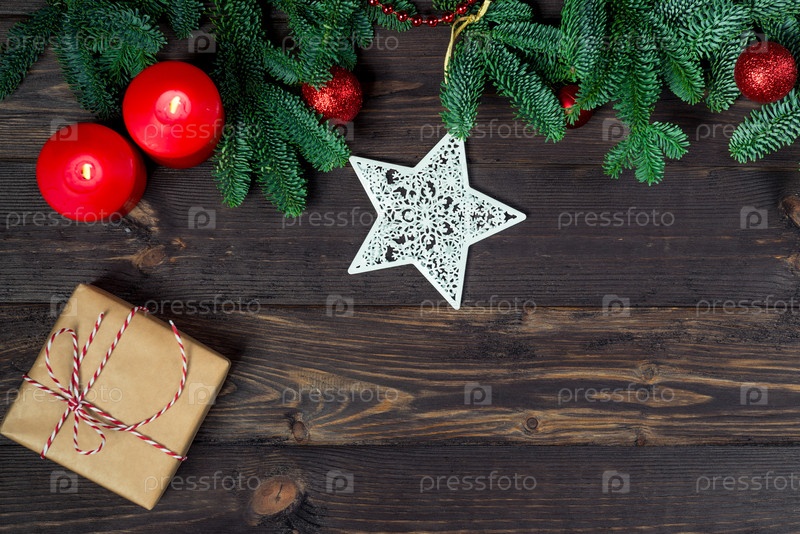 Рождественские подарочные предметы концепт праздника на деревянном столе вверх