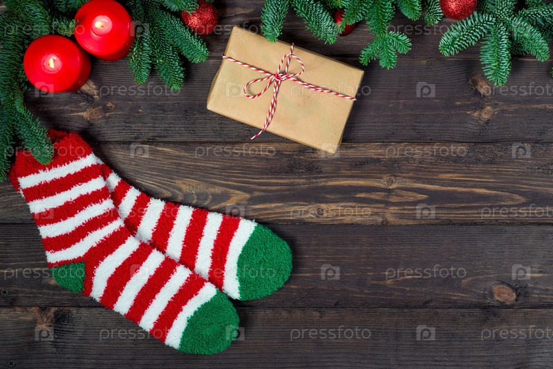 Полосатые рождественские носки рядом с коробкой. Рождественские и подарочные концепт-объекты
