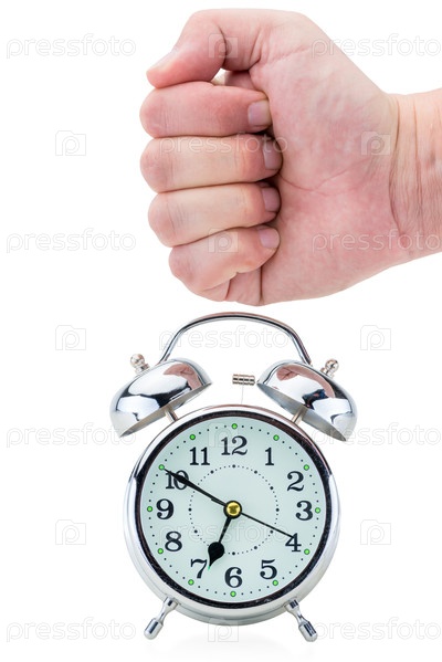 Кулак бьет будильник в стиле ретро фото на белом фоне