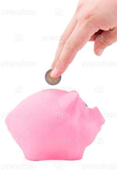 Концепция богатства: мужская рука кладет монету в копилку на белом фоне
