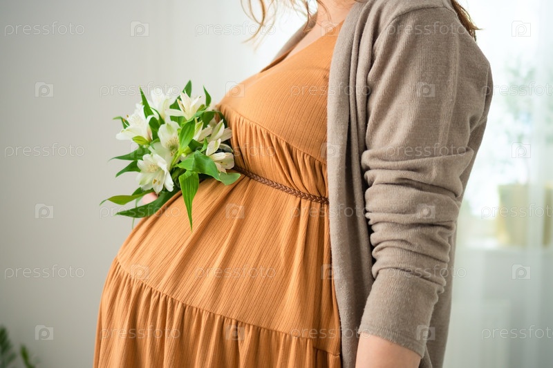 Беременная женщина мягко держит букет белых цветов на животе, надевая плавное коричневое платье, символизирующее воспитание и новые начинания в спокойной обстановке
