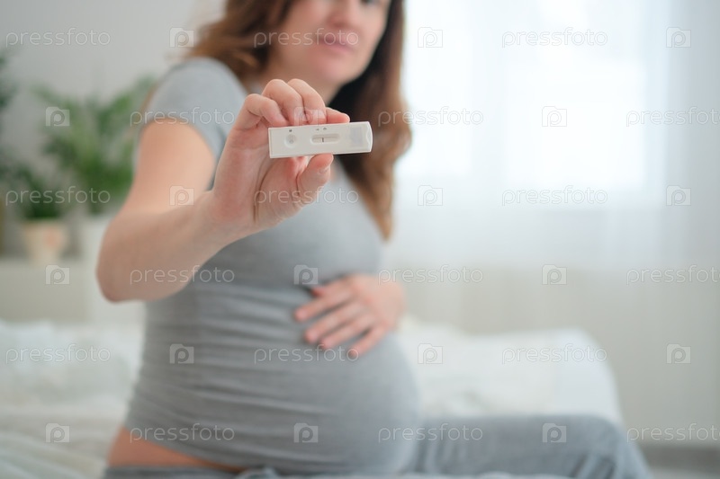 Беременная женщина, сидящая на кровати, проводит тест с радостным выражением лица. Основное внимание уделяется тесту и ее будущей позе, подчеркивая важный жизненный момент