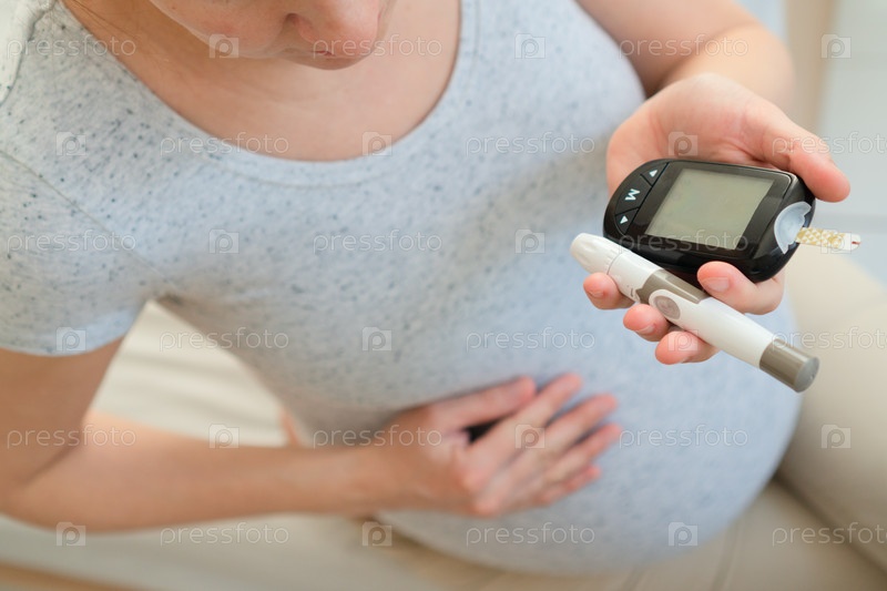 Беременная женщина проверяет уровень сахара в крови глюкометром. Руки вверх, угол сверху вниз. Мониторинг гестационного диабета для безопасной и здоровой беременности