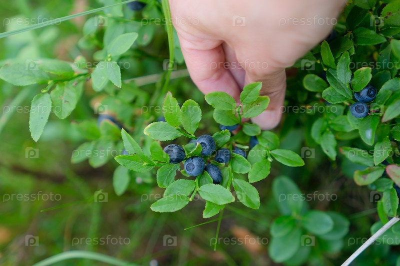 Руки доходят до черничного куста, собирая свежие дикие ягоды. Вид с близкого расстояния на природу