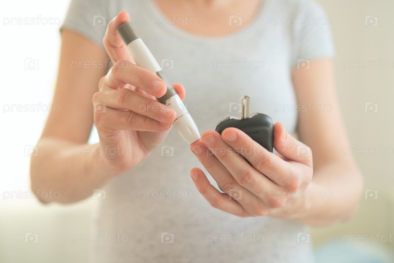 Беременная женщина использует глюкометр крови. Замыкание рук, держащих глюкометр и тест-полоску. Концепция мониторинга гестационного диабета во время беременности