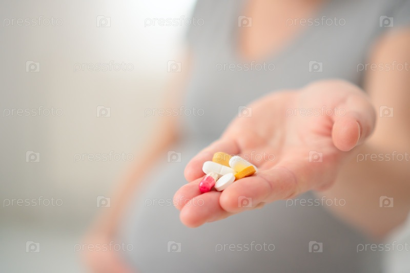 Вид сверху на руку беременной женщины с таблеткой. Концепция пренатального лечения и мониторинга здоровья