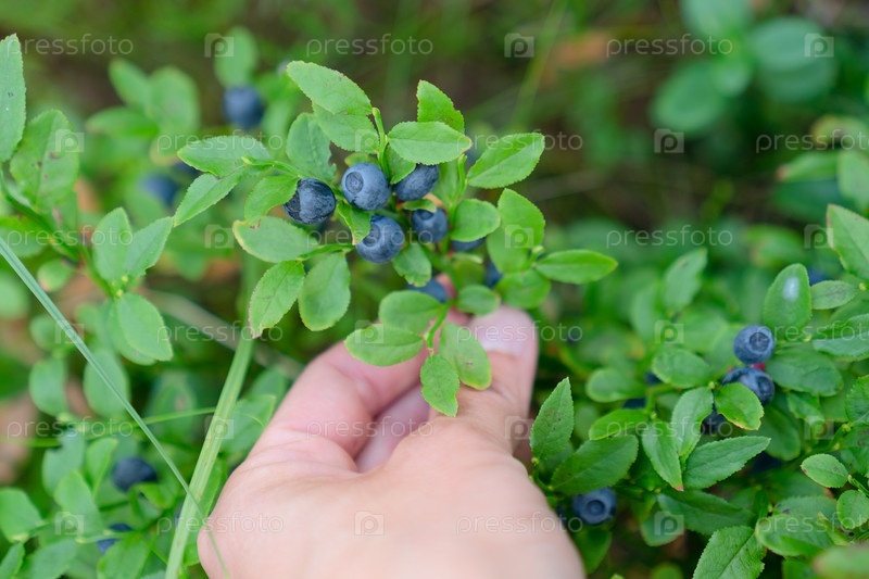 Взрослые руки собирают спелую чернику из куста. Естественная лесная закуска в солнечный день
