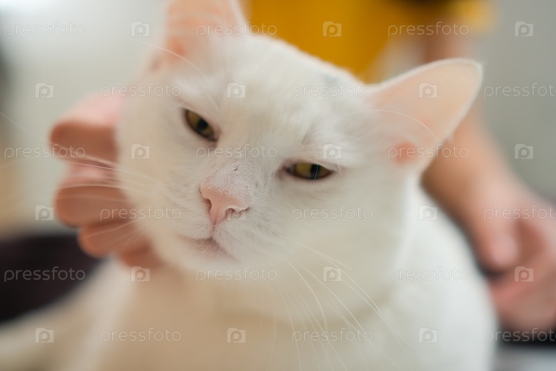 Пышная белая кошка наслаждается нежными мазками с человеческой руки, умиротворенно мурлыкает. Портрет кошачьего счастья и связи между человеком и животным