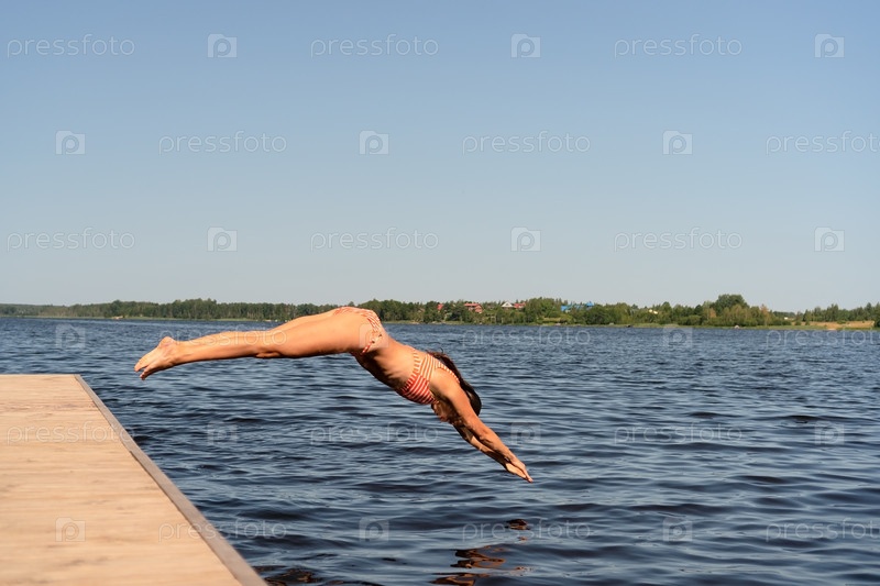 Пригодная женщина ныряет головой с пирса в озеро. Здоровое тело, сильное движение, естественная летняя активность