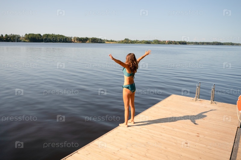 Женщина в купальнике стоит на деревянном пирсе у озера с широко открытыми руками перед плаванием. Солнечная погода, активный образ жизни и отдых на свежем воздухе