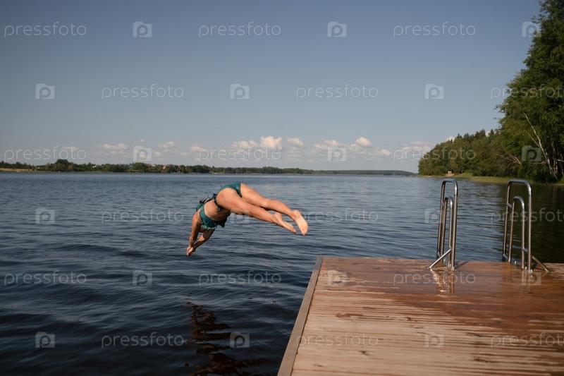 Пригодная женщина ныряет головой с пирса в озеро. Здоровое тело, сильное движение, естественная летняя активность