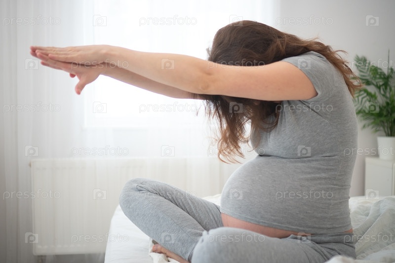 Беременная женщина растягивается в позе лотоса