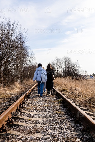 Люди гуляют по железнодорожным путям весной