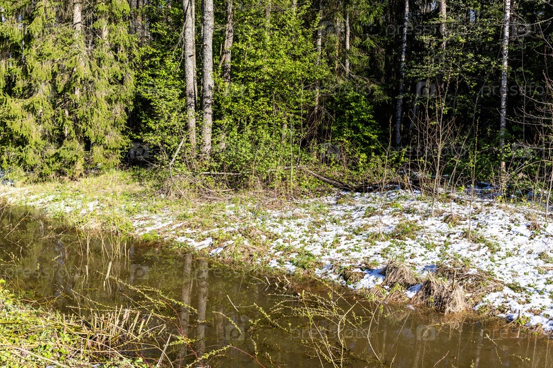 Берег реки со свежевыпавшим снегом на зеленой траве