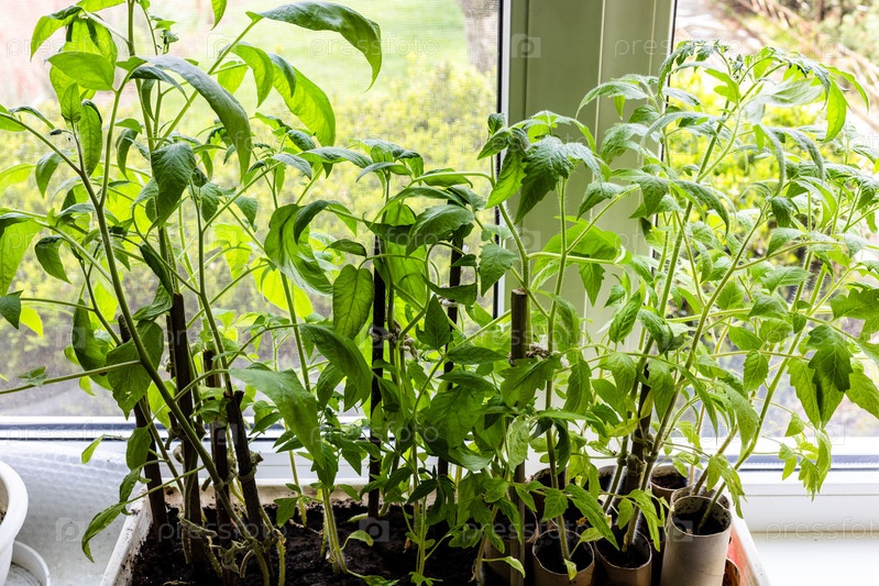 Над видом ростков томатов, выращенных в коробке дома