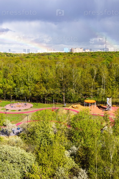 Солнечная игровая площадка рядом с городским парком после дождя