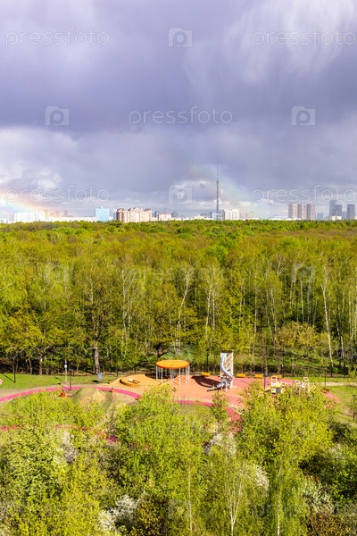 Солнечная игровая площадка и зеленый городской парк после дождя