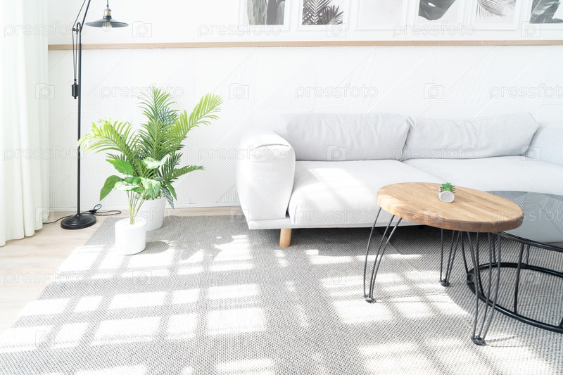 Замечательно яркое жилое пространство с уютным диваном, достаточным естественным освещением и стильным современным декором