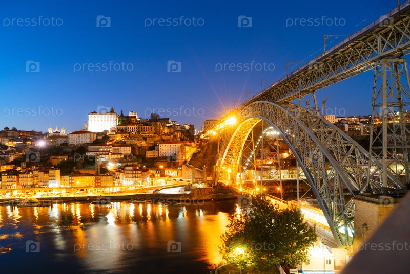 Живописный, красочный вид на старый город Порту со знаменитым мостом ночью, Португалия с мостом Понте Дом Луис над рекой Дору. Опорто, туристический средиземноморский город