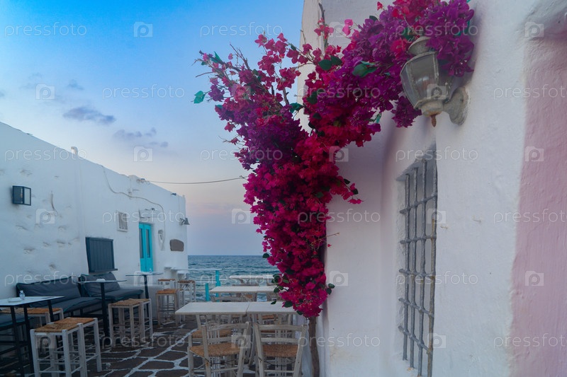 Наусса типичная белая улица, ведущая к морю с солнечным светом, небольшая деревня на острове Парос, Греция