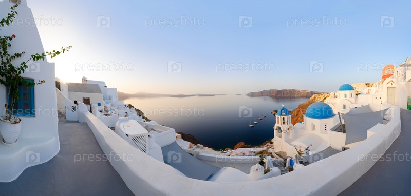 Традиционная греческая деревня Oia of Santorini, с голубыми куполами против Эганского моря и кальдерами, Греция, формат веб-баннера